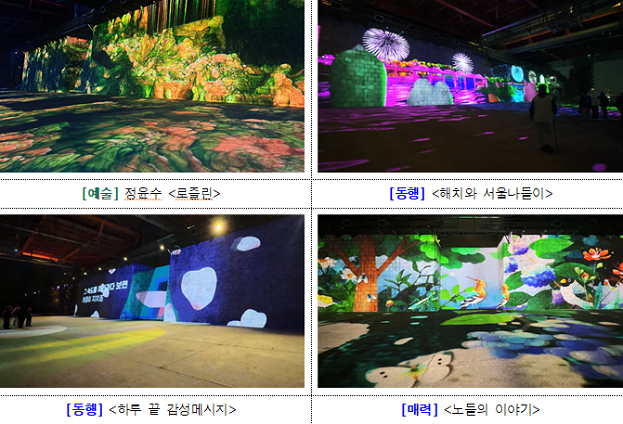 개장 전시는 서울의 핵심 가치인 '예술', '동행', '매력'을 중심으로 세 가지 주요 섹션으로 구성된다. ▲예술 섹션에서는 서효정, 양민하, 정윤수 등 국내 대표 미디어아티스트가 참여해 도시의 흐름과 한강의 생동을 각기 다른 알고리즘과 입자 기법으로 재해석한 '미디어 스케이프'를 선보인다. ▲동행 섹션인 '모먼트 서울'은 시민들에게 응원과 위로를 전하는 감성 메시지 콘텐츠와 서울 상징 캐릭터 해치의 유쾌한 스토리 애니메이션을 통해 소통한다. ▲매력 섹션인 '한강 네이처'는 노들섬과 한강의 생태를 미디어아트 자연도감 형식으로 시각화해 서울의 매력을 부각시킨다.