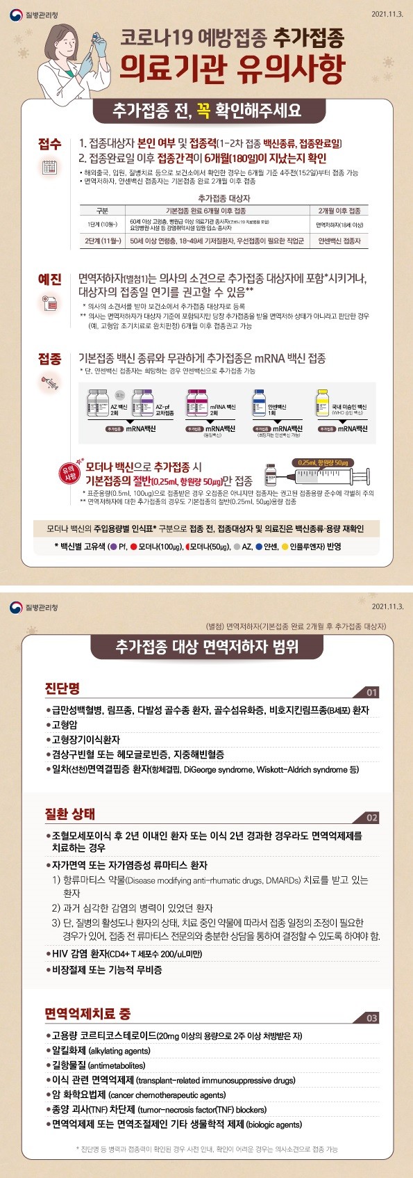 면역저하자(별첨1)는 의사의 소견으로 추가접종 대상자에 포함*시키거나, 대상자의 접종일 연기를 권고할 수 있음**