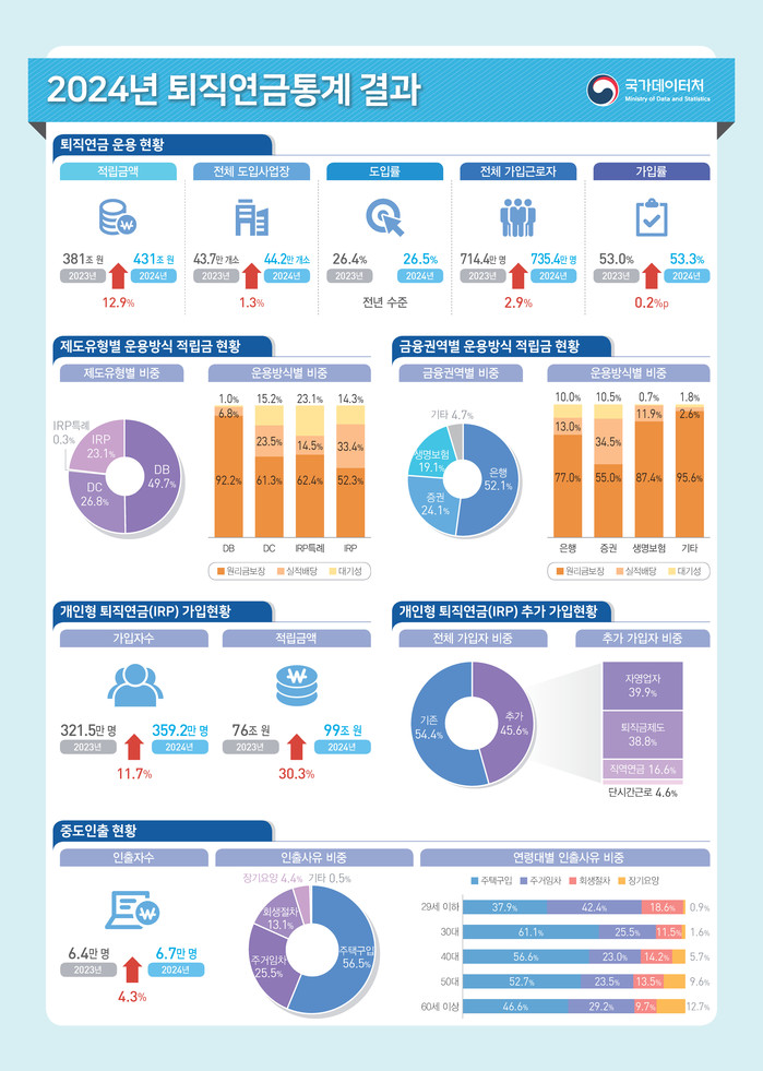 2024년 퇴직연금 총적립금액이 전년 대비 12.9% 증가한 431조 원에 달했다. 이는 확정급여형(DB), 확정기여형(DC), 개인형 퇴직연금(IRP) 모두에서 증가세를 보인 결과다. 특히 개인형 퇴직연금의 적립금액은 99조 원으로 30.3% 증가했다.