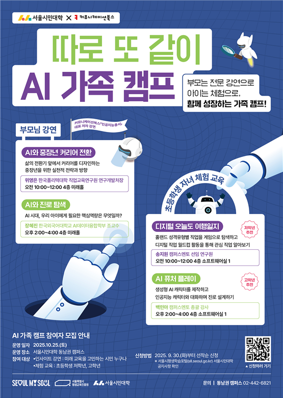 서울시는 10월 25일 서울시민대학 동남권 캠퍼스에서 가족이 함께 AI를 배우고 경험할 수 있는 '따로 또 같이 AI 가족 캠프'를 개최한다고 밝혔다. 이 캠프는 부모와 자녀가 각각의 세션에서 AI를 다양한 방식으로 체험하며, 세대 간의 이해를 돕기 위해 기획됐다. 참가 신청은 9월 30일부터 서울시평생학습포털을 통해 가능하며, 참가비는 무료다.