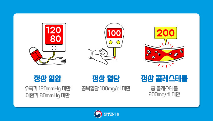 심뇌혈관질환의 예방과 관리를 위해서는 자신의 혈압, 혈당, 콜레스테롤 수치를 정기적으로 확인하고 올바른 생활수칙 실천이 중요하다.