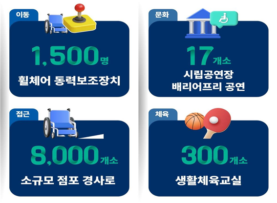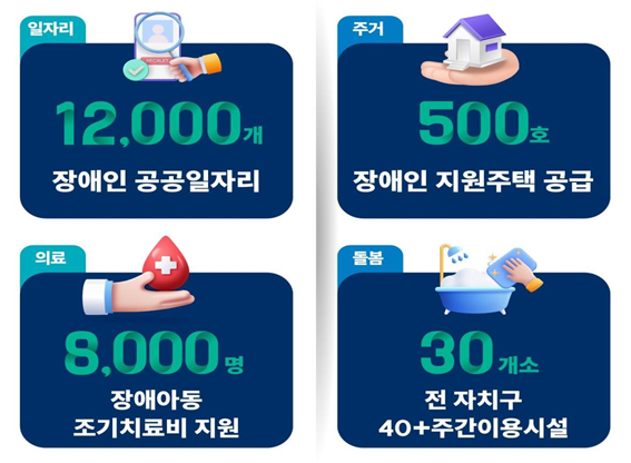 주거 분야에서는 장애인 지원주택을 500가구로 확대하고, 공동생활가정을 250곳으로 늘릴 계획이다. 이동권을 보장하기 위해 저상버스를 100% 도입하고, AI와 로봇 기술을 활용한 첨단 보조기기를 보급할 예정이다.