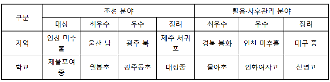 신규 조성 분야에서는 ‘혜윰뜰(지혜의 숲)’이라는 주제로 학생들이 학교숲 조성에 참여해 창의적인 공간을 조성하고 ‘탄소중립 학교’를 목표로 하는 인천 미추홀구 제물포여자중학교가 대상으로 선정됐다.