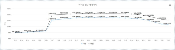 국토교통부 산하 한국부동산원의 부동산통계뷰어(R-ONE) 자료에 따르면, 양천구의 아파트 평균 매매가격은 토지거래허가구역 지정과 무관하게 2021년 부동산 가격 급등기에 급격한 상승, 그리고 최근 부동산 시장 침체에 따른 가격 하락에 따라가는 모습을 보이고 있다.