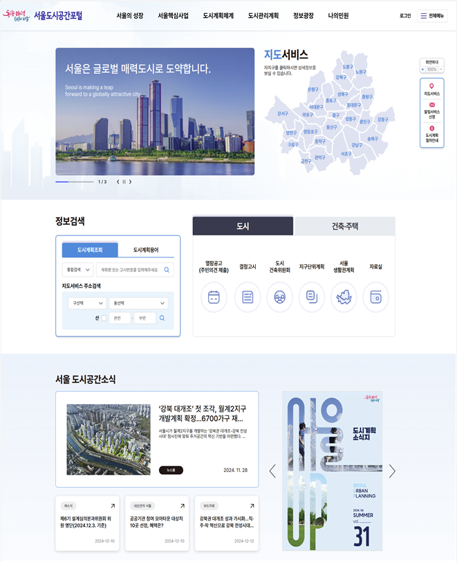 우선 포털 메인화면 중앙에 ‘도시’, ‘건축‧주택’ 메뉴를 표출해 이용자 편의를 높였다. ‘도시’ 메뉴는 시민 이용이 많은 ▲열람공고 ▲결정고시 ▲지구단위계획 콘텐츠를 ‘건축·주택’ 메뉴에는 서울시 재개발·재건축 정비사업과 주택·건축 및 부동산 정보를 담았다.