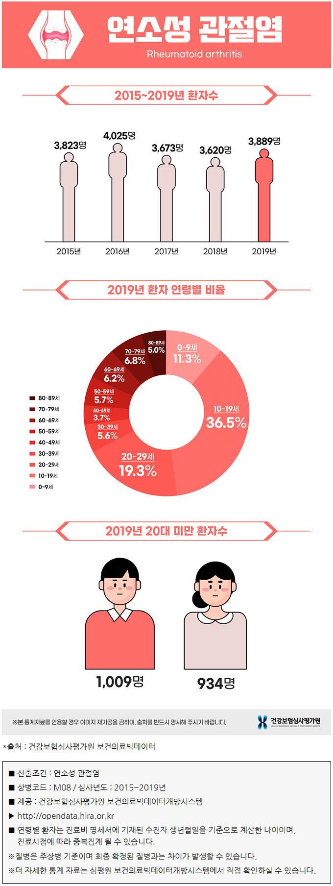 건강보험심사평가원의 통계에 따르면 2019년 연소성 관절염 수진자수는 3889명으로 2018년보다 약 7% 증가했습니다. 2019년 수진자를 연령별로 보면 10대가 36.5%(1483명)로 가장 높은 비율을 차지했습니다. 그 뒤로는 20대가 19.3%(783명), 9세 이하가 11.3%(460명)를 차지했습니다. 20세 이하 수진자는 남자가 1009명, 여자가 934명으로 남성 수진자가 근소하게 더 많았습니다.