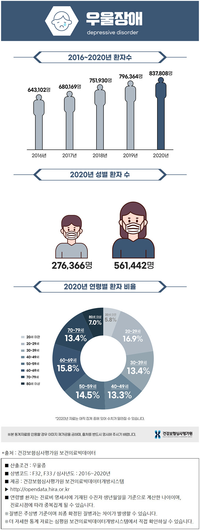 건강보험심사평가원의 통계에 따르면 2020년 우울증으로 병원을 찾은 환자는 83만 7808명으로 2016년 대비 약 30% 증가했습니다. 우울증 환자는 남성보다 여성이 약 2배 정도 많았습니다. 연령별로는 20대 환자가 16.9%로 가장 많았고, 60대 환자가 15.8%, 50대 환자가 14.5%로 뒤를 이었습니다.