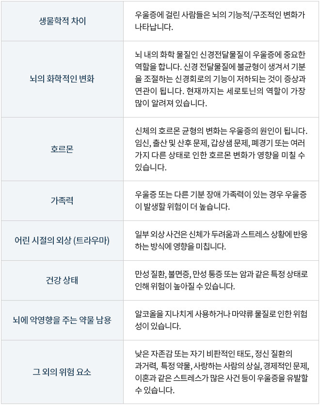 주요 우울장애의 원인으로 심리 사회적, 생물학적, 유전적 요인 등이 다수 제기되고 있으나, 아직 원인이 명확하지 않습니다.