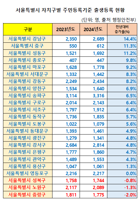 국민의힘 윤영희 서울시의원이 서울시와 행정안전부 자료를 분석한 결과, 25개 자치구 중 22곳에서 출생아 수가 증가했다. 특히 강남구(14.4%), 중구(11.3%), 성동구(11.2%) 등이 두 자릿수 증가율을 기록하며 주목받았다.
