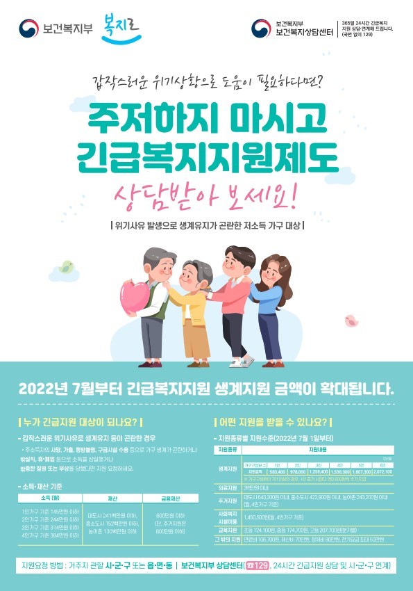 권양근 경남도 복지보건국장은 “고유가·고물가로 인해 도움이 절실히 필요한 위기가구가 더욱 많을 것으로 예상된다”며 “우리 도는 읍면동 누리집, 이통장회의 등 다양한 방법으로 홍보해 긴급복지 제도가 위기상황에 놓인 도민 누구나가 도움을 요청할 수 있도록 지원하고 복지사각지대 최소화에 적극 노력하겠다”고 밝혔다.