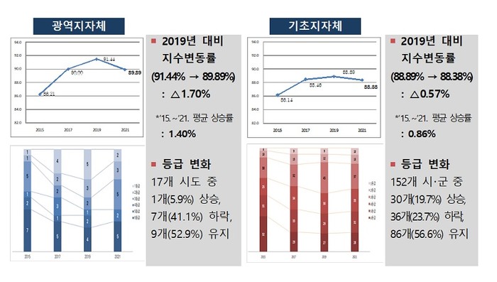 이번 결과를 2019년과 비교해보면 지역의 발전지수 평균은 광역지자체가 1.7%포인트(91.44%→89.89%), 기초지자체가 0.57%포인트(88.89%→88.38%) 낮아졌다. 지역별 등급은 광역지자체가 17개 시도 중 1개 지역(5.9%)이 상승, 7개 지역(41.2%)이 하락했고 기초지자체는 152개 시·군 중 30개 지역(19.7%)이 상승, 36개 지역(23.7%)이 하락해 전반적으로 관광 발전 수준이 감소한 것으로 나타났다. 이는 코로나19 발생과 장기화가 지역 관광에 영향을 미쳤기 때문으로 보인다.