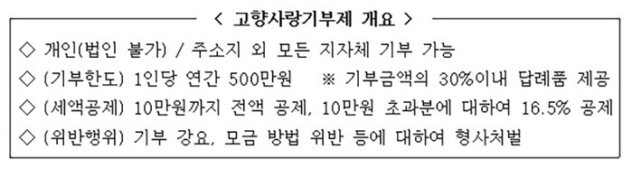 고향사랑기부제는 출생 지역은 물론 학업·근무·여행 등을 통해 관계를 맺은 ‘제2의 고향’ 등에 기부하면 세액공제와 답례품 혜택이 주어지는 제도로 새해부터 시행했다.