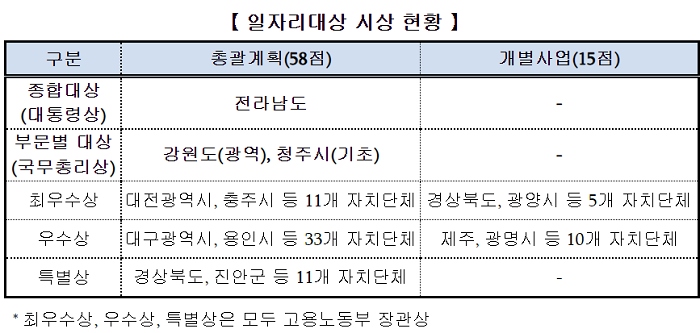 종합대상(대통령상)을 받은 전라남도는 '광역-기초 일자리 동행(同行)'을 통해 기초자치단체의 열악한 일자리 재정을 보완해 지역 전체 일자리 창출 효과(4,248명 고용창출)를 달성한 점이 높은 평가를 받았다.