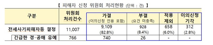 그간 위원회에서 최종의결한 전세사기피해자등 가결 건은 총 9109건(누계)이며, 긴급 경·공매 유예 협조요청 가결 건은 총 740건(누계)이다.