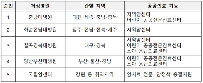 이에 충남권역 충남대병원과 호남권역 화순전남대병원, 경북권역 칠곡경북대병원, 경남권역 양산부산대병원 그리고 경기권역에는 국립암센터를 선정했다.