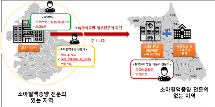 이는 대학병원 소속 소아혈액종양 전문의와 지역 병·의원에 근무 중인 소아암 치료경력이 있는 전문의가 거점병원의 진료에 참여하는 개방형 인력 활용 모형이다.