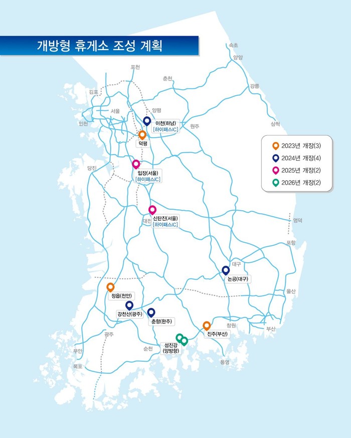 올해는 지자체와 협의를 마친 정읍, 진주, 덕평 휴게소 등 3곳을 우선 개장한다. 이어 내년에는 이천·논공·강천산·춘향 휴게소, 2025년 신탄진·입장 휴게소, 2026년 섬진강 휴게소(양방향) 등 총 11곳으로 확대된다.