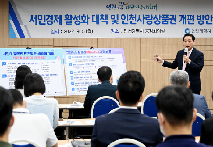 인천광역시는 9월 5일 유정복 시장이 시청 공감회의실에서 이음카드의 문제점 개선과 지속가능성 확보 등의 내용을 담은 ‘인천사랑상품권 개편방안’을 발표했다고 밝혔다.