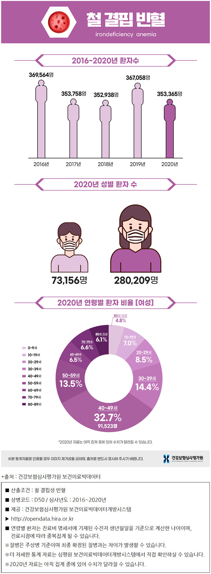 건강보험심사평가원의 통계에 따르면 철 결핍성 빈혈로 병원을 찾는 환자는 매년 35만 명을 넘어서고 있는데요. 특히 환자 중 여성의 비율이 압도적으로 높습니다. 2020년에는 전체 환자 중 여성 환자가 79.2%를 차지했는데요. 환자 5명 중 4명이 여성인 꼴입니다. 여성 환자를 연령별로 살펴보았을 때는 40대 환자가 32.7%로 가장 많았으며, 30대가 그다음으로 많았습니다.