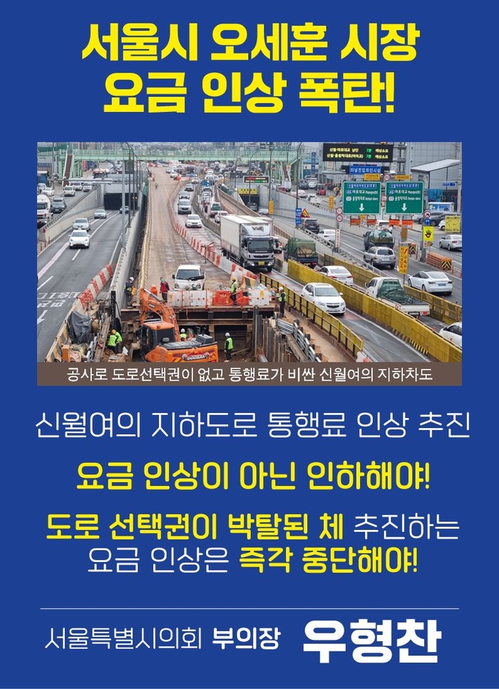 | 우형찬 의원이 상대적으로 통행료가 비싼 신월여의 지하도로는 요금 인상이 아닌 인하를 주장했다. 사진=우형찬 의원실 |