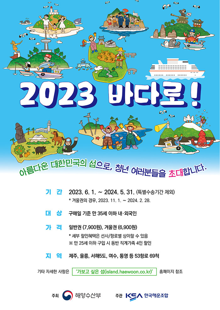 조승환 해수부 장관은 “일상 회복을 맞아 ‘바다로’를 이용해 가족과 함께 여객선을 타고 섬 여행을 떠나보실 것을 권한다”며 “안전한 여행이 될 수 있도록 정부도 여객 서비스와 여객선 안전 점검·관리에 최선을 다하겠다”고 말했다.
