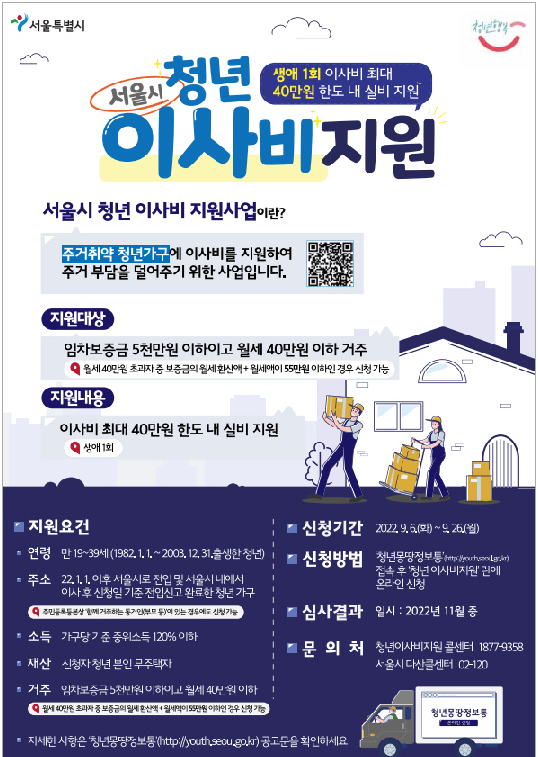 서울시가 주거취약계층 청년들의 주거비 부담을 덜어주기 위해 ‘이사비’ 지원에 나선다. 차량 대여비, 운반비, 포장비 등 실제 이사에 소요된 비용을 최대 40만 원까지 실비로 생애 1회에 한해 지원한다.