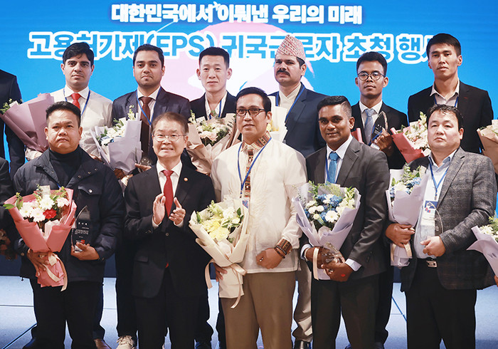 | ▲이정식 고용노동부 장관이 지난 22일 오후 서울 중구 노보텔 앰배서더 호텔에서 열린 <고용허가제 귀국근로자 초청 행사>에서 수상자들과 기념촬영을 하고 있다. (사진= 연합뉴스) |