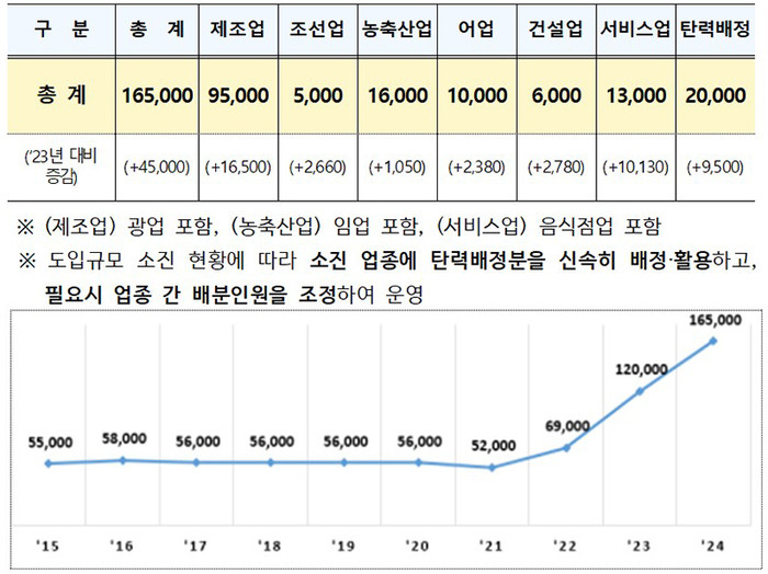 이에 정부는 노동시장 인력 수급상황을 고려해 2024년 외국인력 도입규모를 올해 12만 명보다 4만 5000명 늘린 16만 5000명으로 정했다.