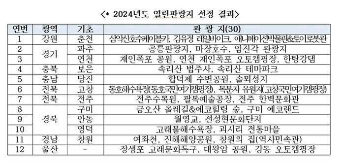 문체부는 1차 신청 자격 확인, 2차 서면 심사, 3차 현장평가를 거쳐 유네스코 세계문화유산, 레일바이크 등 누구나 선호하는 관광지 30곳을 최종 선정했다.