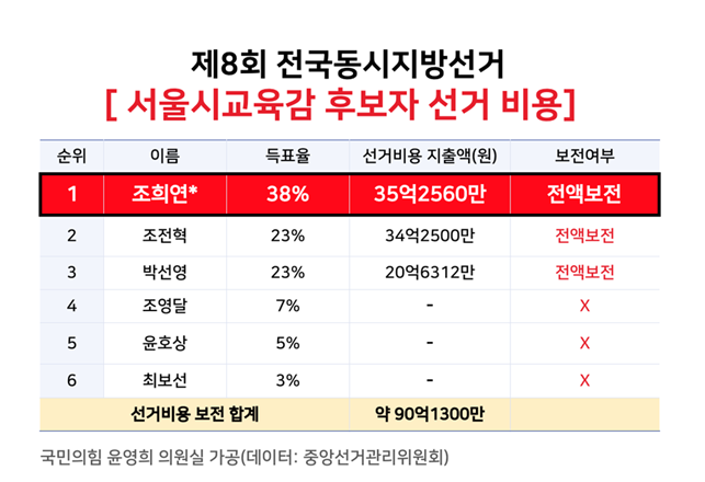첫 번째. 조 교육감의 귀책으로 인해 발생하는 재·보궐 선거비용은 누가 책임지냐는 것입니다. 35억 2천5백6십만 원. 2년 전 조희연 서울 교육감이 본인 선거에 사용한 비용입니다. 조 교육감은 이 돈을 전액 세금으로 보전받았습니다. 당선무효가 확정되면, 당연히 국고로 반환해야 합니다. 당시 서울 교육감 선거에 출마한 다른 후보들이 보전받은 세금을 다 합하면 그 금액은 더욱 어마어마합니다. 100억 원에 육박합니다.