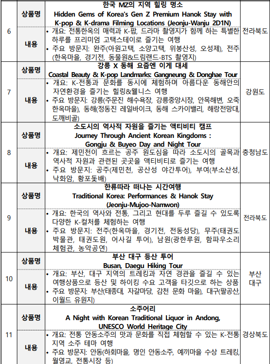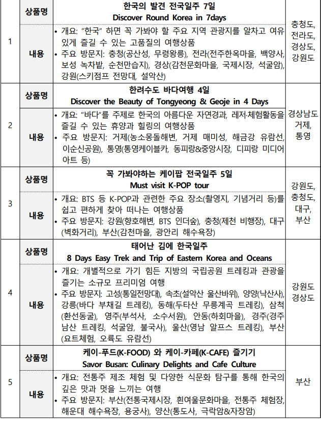 케이팝, 한국 음식, 전통, 자연, 치유, 등산 등의 주제로 관광 일정 구성