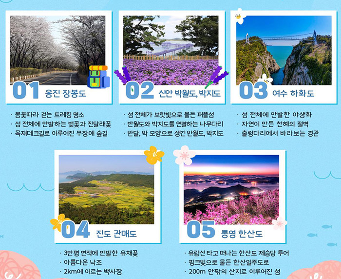 한편 이번에 봄섬으로 선정한 5곳에 대한 여행정보는 한국관광공사에서 운영하는 누리집 ‘대한민국 구석구석’에서 확인할 수 있다.
