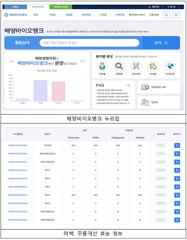 이들 화장품 제조에 활용되는 추출물 등 소재는 해양바이오뱅크 누리집(www.mbris.kr/biobank)을 이용해 누구나 분양받을 수 있다.