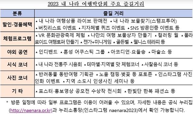 올해로 20회를 맞는 내 나라 여행박람회는 전국 지자체들이 한 자리에 모이는 국내 유일의 전국 박람회로, 2004년 1회 개최 이후 규모가 지속 성장하여 매년 10만여 명의 방문객이 찾는 국내 최대의 여행박람회이다. 올해 박람회에는 99개 기관이 참가하여 200여 개 부스를 운영해 우리나라 관광의 매력을 홍보할 예정이다.