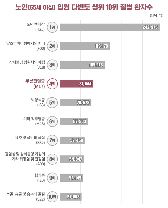 2019년 한 해 동안 입원한 65세 이상 노인이 많았던 질병을 소개해드리고 있습니다. 네 번째 질병은 관절 연골이 마모되어 진행되는 무릎관절증입니다.