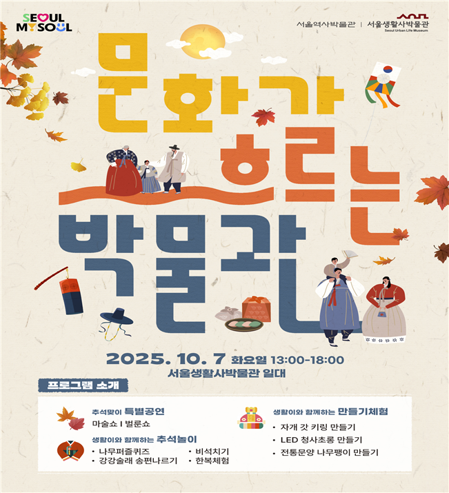 서울생활사박물관이 추석 연휴를 맞아 시민들에게 다채로운 문화 체험의 기회를 제공한다. 오는 10월 7일 오후 1시부터 6시까지 서울생활사박물관에서 열리는 '추석맞이 문화가 흐르는 박물관' 행사에서는 마술쇼, 벌룬 공연, 나무퍼즐퀴즈, 비석치기, 강강술래 송편나르기, 한복체험 등 다양한 프로그램을 무료로 즐길 수 있다.
