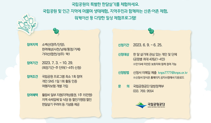이번 행사 참여자들은 해당 국립공원 지역에서 행사 운영 기간(7월 3일~10월 29일)에 최대 4주간 머물며 SNS에 활동 내용을 올리는 등 ‘국립공원 한 달 살기’ 홍보 활동을 수행한다.