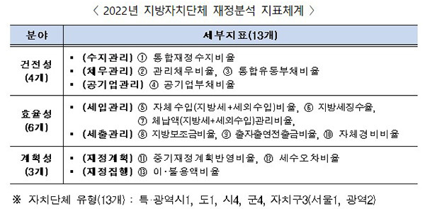 이번 재정분석은 건전성, 효율성, 계획성 등 3개 분야 13개 지표를 사용해 지방재정을 총망라하는 수준으로 분석했고, 인구·재정 여건이 유사한 13개 자치단체 군으로 유형화해 평가했다.