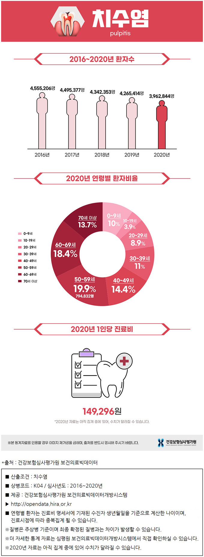 최근 5년간 치수염 환자 수는 감소하고 있는 추세지만 여전히 많은 환자 수를 기록하고 있는데요. 치수염의 경우 1인당 진료비는 2020년에 14만 9296원으로 치과 외래 다빈도 질병 상위 10개 중 두 번째로 높았습니다.