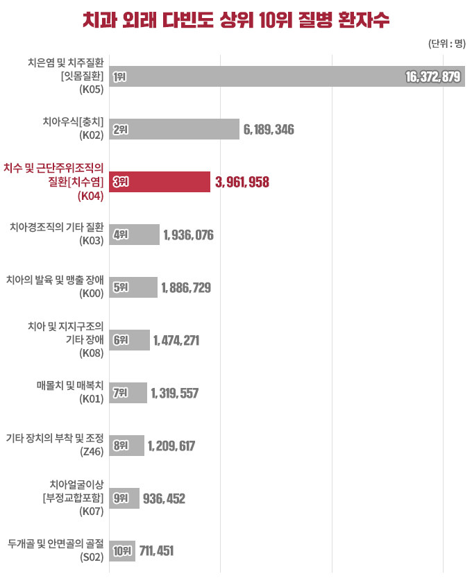 2020년 한 해 동안 치과 외래 진료가 많았던 질병을 소개해드리고 있습니다. 세 번째 질병은 치수의 세균감염이나 치아 손상으로 인해 발생하는 치수염입니다.