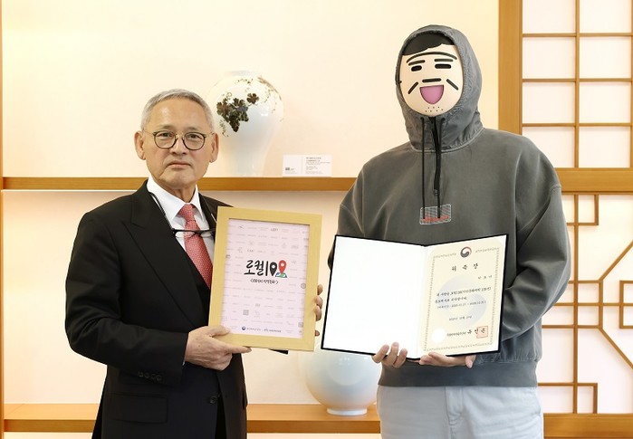 | ▲유인촌 문화체육관광부 장관이 17일 서울 종로구 국립현대미술관 서울관에서 일러스트레이터 키크니에게 로컬100(지역문화매력100선) 홍보대사 위촉장을 수여한 뒤 키크니가 제작한 로컬100 홍보 포스터를 들고 기념촬영을 하고 있다.(사진=문화체육관광부) |
