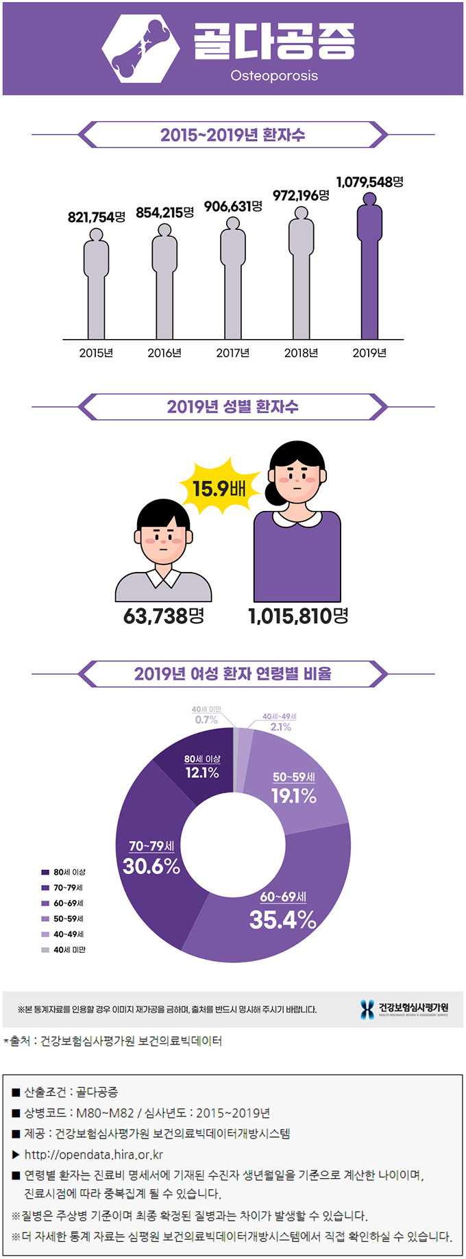 건강보험심사평가원의 통계에 따르면 2019년 골다공증 환자 중 여성이 101만 5810명, 남성이 6만 3738명으로 여성 환자가 남성 환자의 16배 가까이 많았습니다. 환자 수는 해마다 증가하고 있으며, 60대 이상 여성 환자가 전체 여성 환자 중 약 78%를 차지할 만큼 고령의 여성이 특히 조심해야 할 질환입니다.