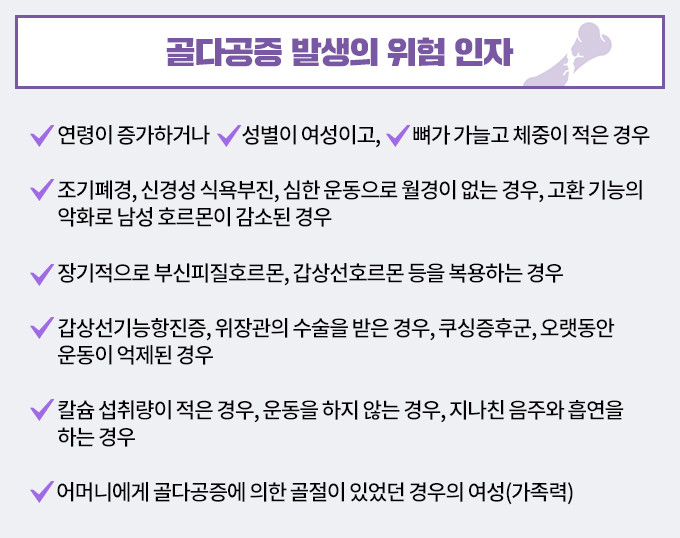 골다공증은 노화, 폐경, 호르몬의 변화, 혹은 약물 등의 원인으로 발생하는데요. 특히 다음과 같은 위험 인자가 있을 경우 발생할 가능성이 높아집니다.