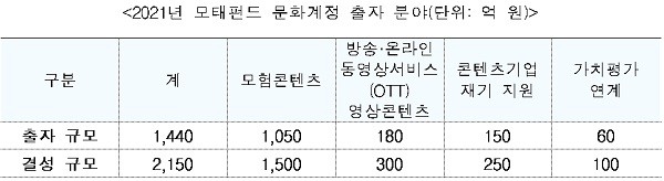문체부는 올해 모태펀드 문화계정(이하 문화산업 투자금)에 1440억 원을 출자해 총 2150억 원 규모의 투자금을 조성한다. 또한 ▲모험콘텐츠 자금 ▲방송·온라인동영상서비스(OTT) 영상콘텐츠 자금 ▲콘텐츠기업 재기지원 자금 ▲콘텐츠 가치평가 연계 자금 등 4개 분야로 구성·운영한다.