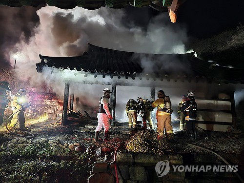 | ▲29일 오후 화재가 발생한 경기도 안성시 죽산면 칠장리 칠장사 내  요사채(승려 거처 장소)에서 소방대원들이 화재를 진압하고 있다. |
