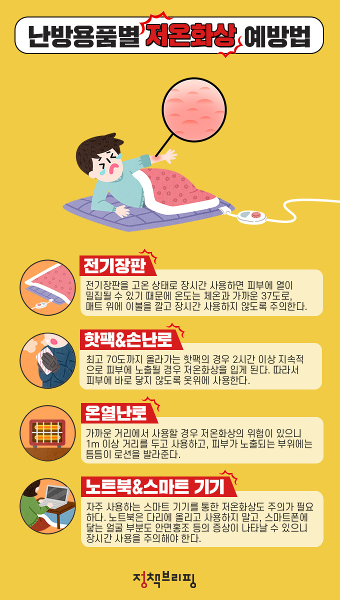 자주 사용하는 스마트 기기를 통한 저온화상도 주의가 필요하다. 노트북은 다리에 올리고 사용하지 말고, 스마트폰에 닿는 얼굴 부분도 안면홍보 등의 증상이 나타날 수 있으니 장시간 사용을 주의해야 한다.