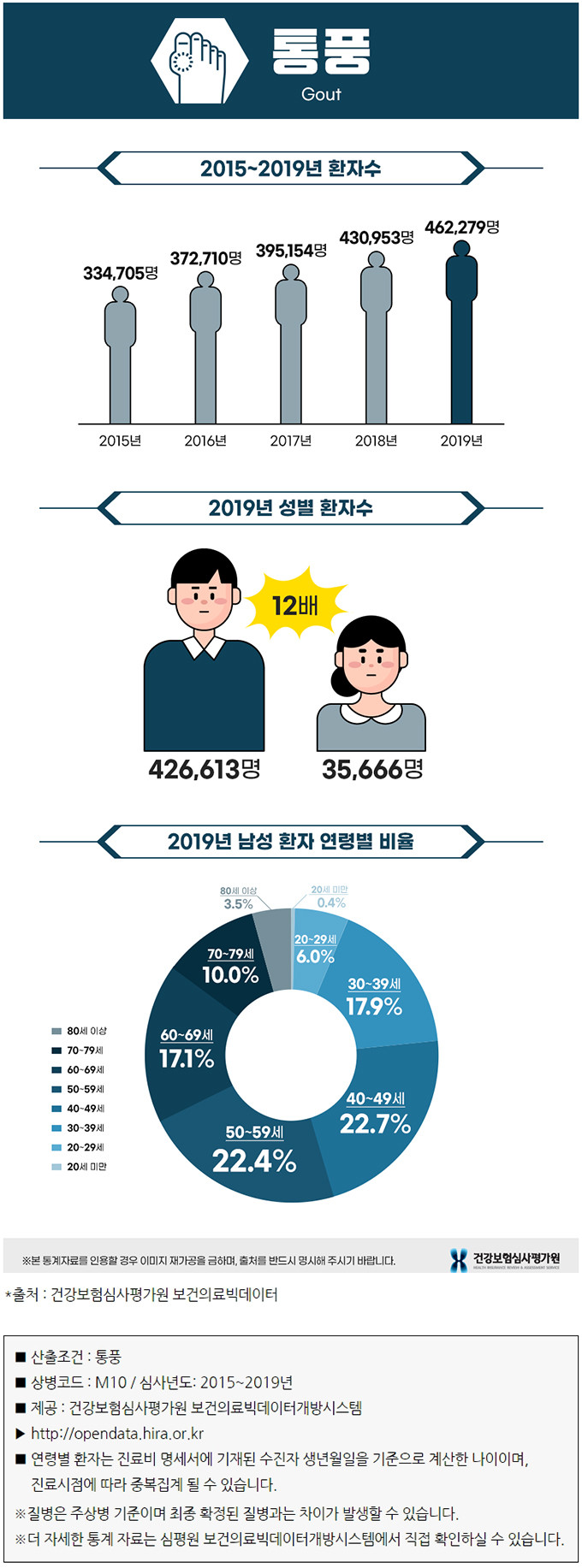 건강보험심사평가원의 통계에 따르면 2019년 통풍 수진자수는 46만 2279명이었으며, 남성이 여성보다 약 12배 많은 42만 6613명이었습니다. 연령별로 보면 40대가 전체 수진자의 22.7%(10만 4897명)로 가장 많았으며, 50대가 22.4%, 30대가 17.9%를 차지했습니다.