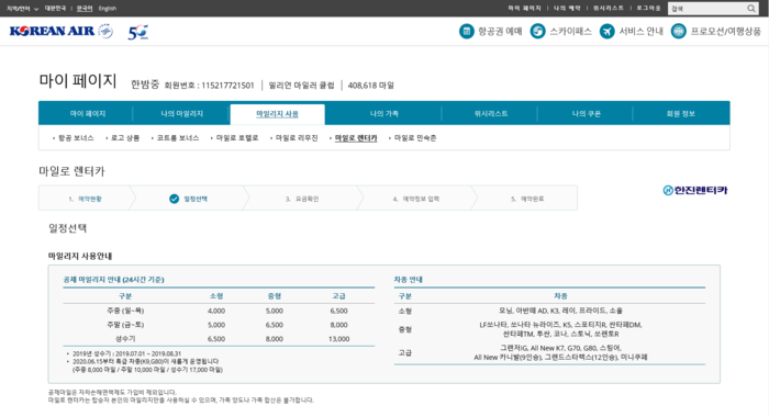 | 마일로렌터카 예약 화면. (사진=대한항공) |