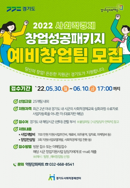 경기도일자리재단 경기도사회적경제센터가 사회적경제기업 예비창업자의 단계별 성장을 지원하기 위해 다음 달 10일까지 25개 예비창업팀을 모집한다.