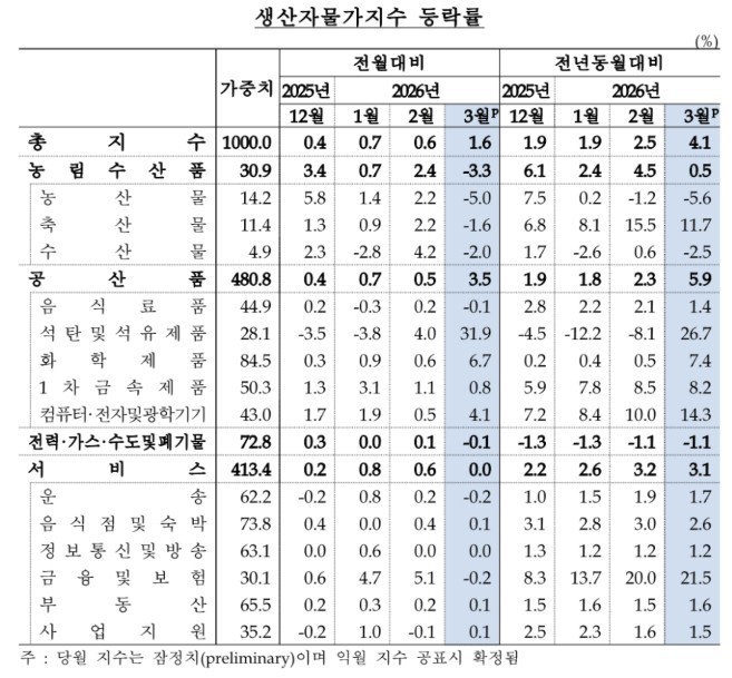 이문희 물가통계팀장은 "3월 유가가 급등했고, 원자재 가격 상승으로 점차 파급될 것으로 예상한다"며 "생산자물가의 상방 압력으로 작용할 것"이라고 분석했다. 이어 "미국과 이란의 협상 불확실성이 매우 높아서 현재로서는 앞으로의 흐름을 가늠하기 어려운 상황"이라고 덧붙였다.